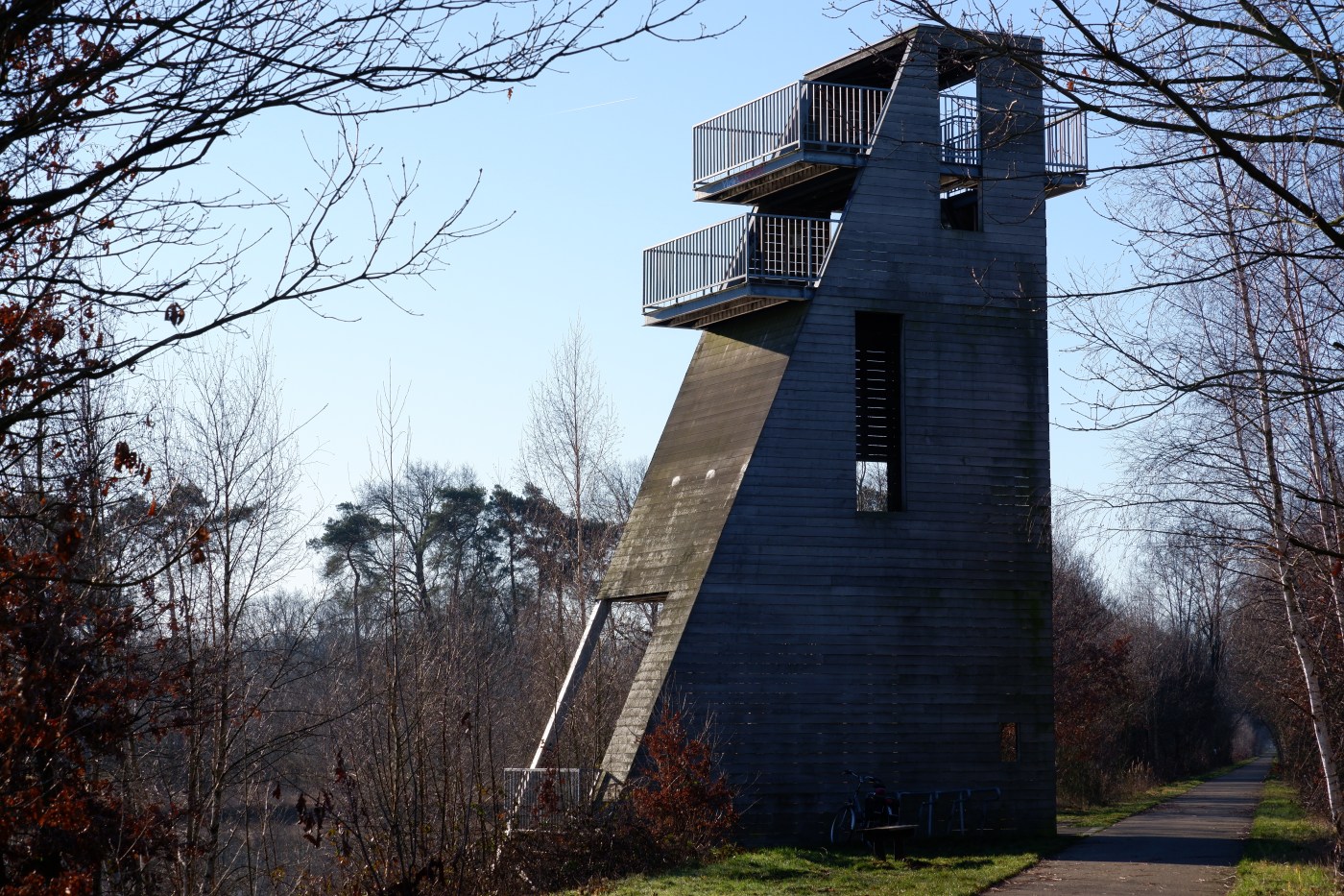 Waar ooit de trein naar Nederland reed is nu een fietspad gemaakt. Vlak naar deze fietspad is deze toren geplaatst. Zelfs op de begane grond heb je reeds een fantastisch uitzicht over de waterplassen van het Vennengebied in Turnhout.