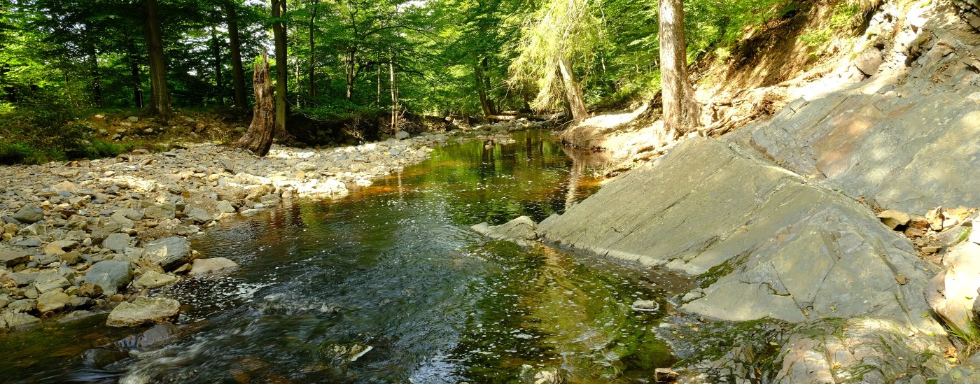 Neem het bruggetje over rivier de Getzbach en ga daarna een heel eind mee naast de rivier tot aan de kleine stuwdam.