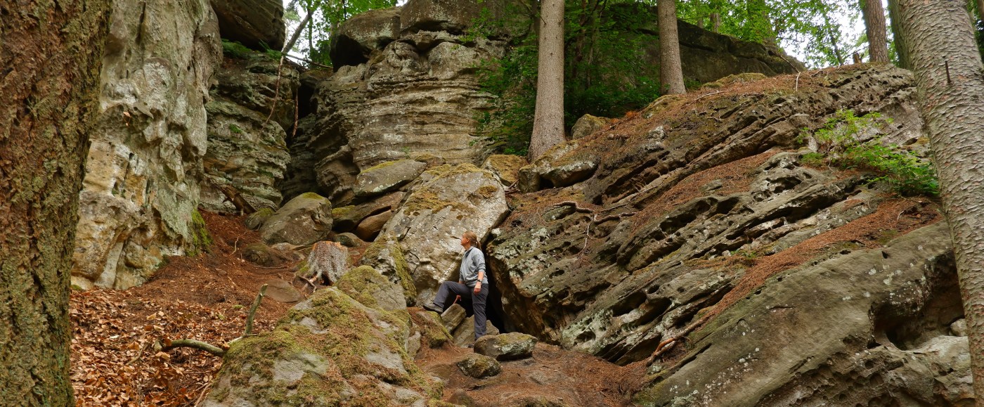De pikdonker spleten van dit deel zijn de absolute topper van deze wandelroute. Lekker smal en je zal jezelf af en toe een kopje kleiner moeten maken. Kijk niet alleen naar boven, maar ook naar de grond er zijn hier een aantal trappen aanwezig.